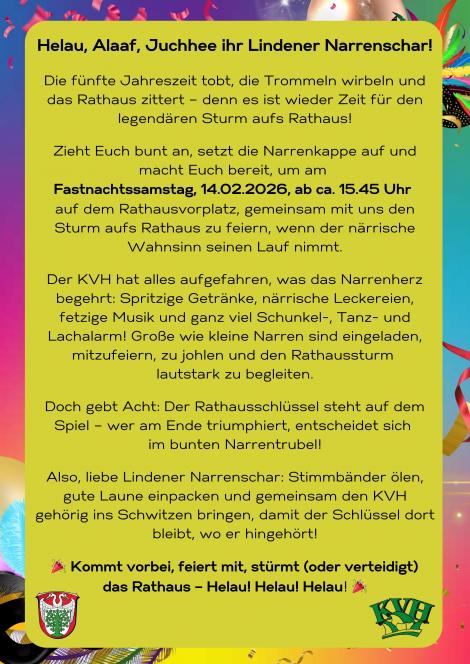 Zieht Euch bunt an, setzt die Narrenkappe auf und macht Euch bereit, um am Fastnachtssamstag, 14.02.2026, ab ca. 15.45 Uhr auf dem Rathausvorplatz, gemeinsam mit uns den Sturm aufs Rathaus zu feiern, wenn der närrische Wahnsinn seinen Lauf nimmt.